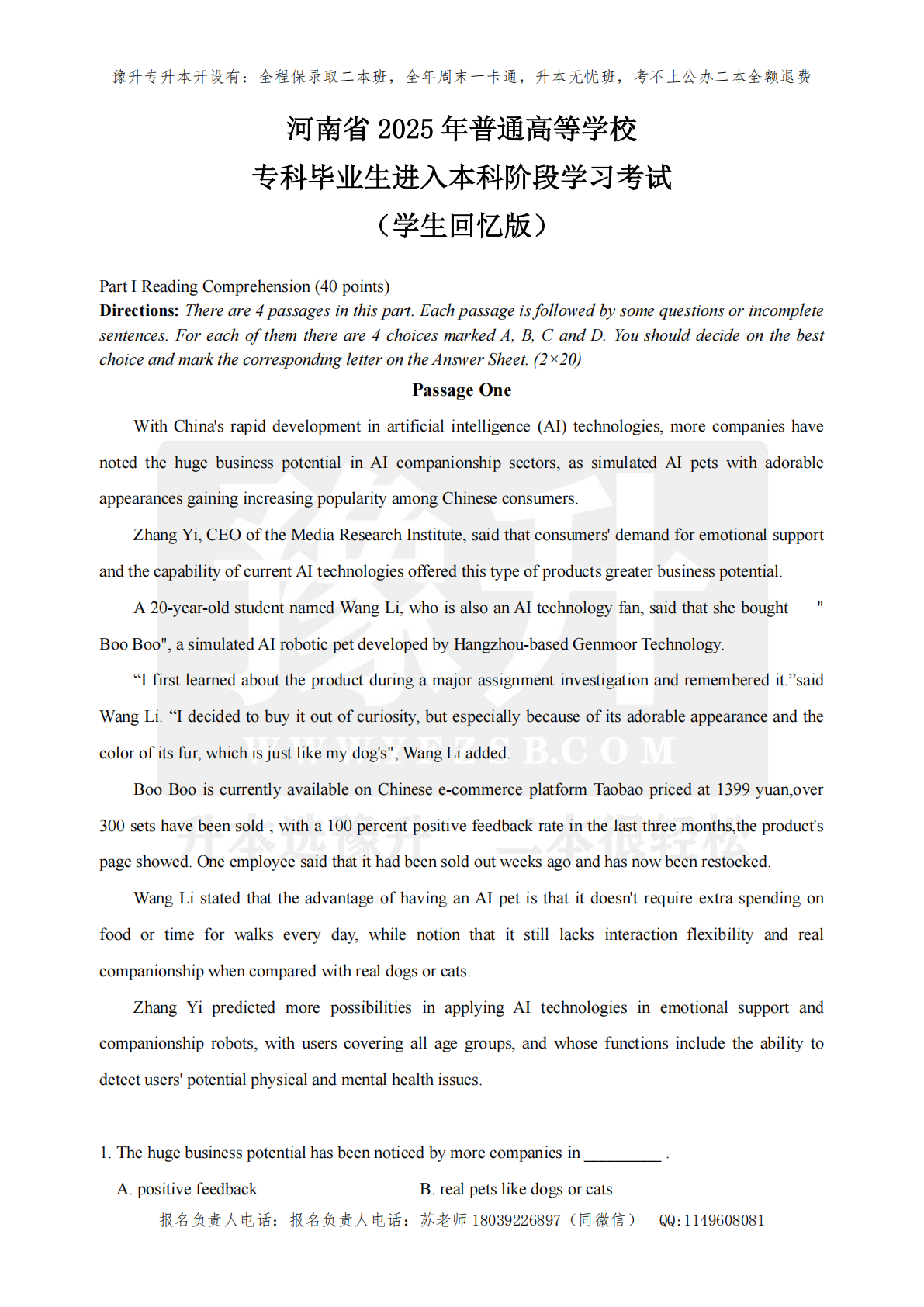 河南专升本2025年真题——英语